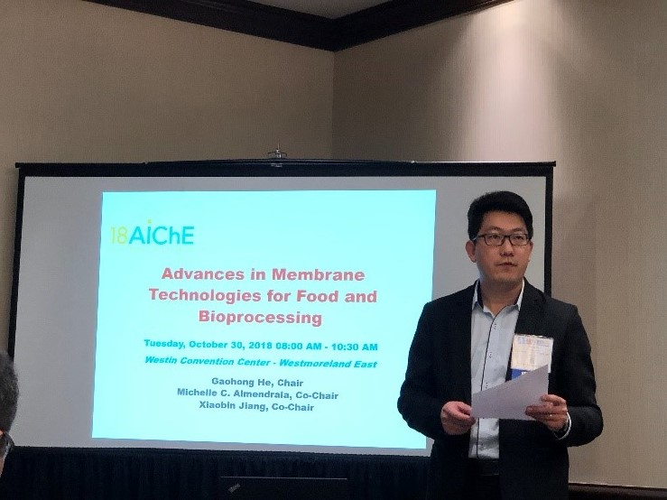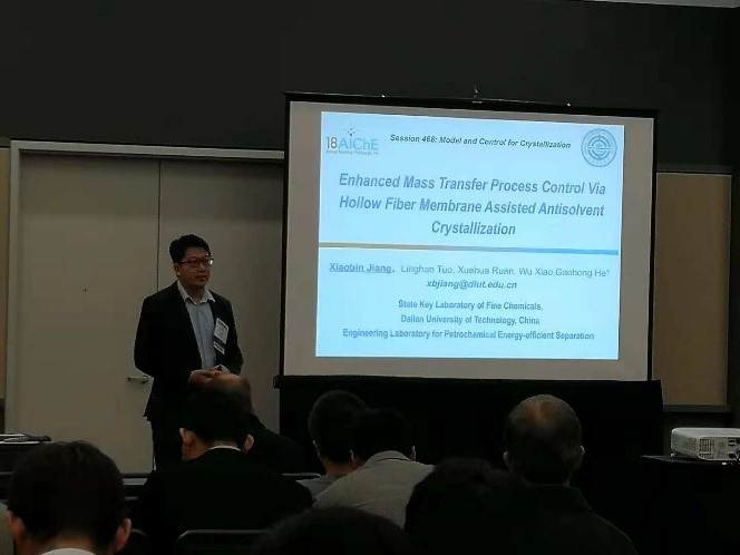 姜晓滨教授作为255:Advances in Membrane Technologies for Food and Bioprocessing、684&723:Solid Form Selection: Cocrystals, Salts, Solvates, Polymorphs, and Beyond 两个主题分会的共同主席,主持分会。做题为Enhanced Mass Transfer Process Control Via Hollow Fiber Membrane Assisted Antisolvent Crystallization口头报告与Crystal Morphology and Process Control of Multiple High-Salinity Wastewater Treatment Via Membrane Distillation Crystallization海报展示。