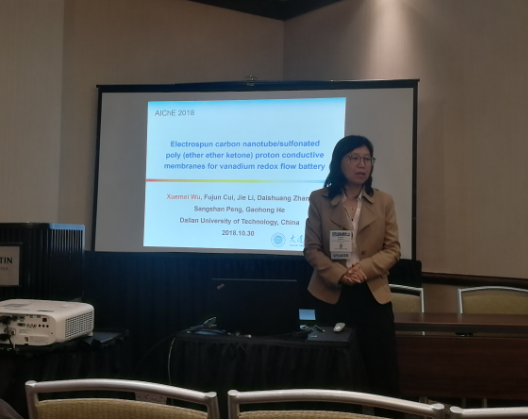 吴雪梅教授做了题为Electrospun Carbon Nanotube/Sulfonated Poly (ether ether ketone) Proton Conductive Membranes for Vanadium Redox Flow Battery的口头汇报。