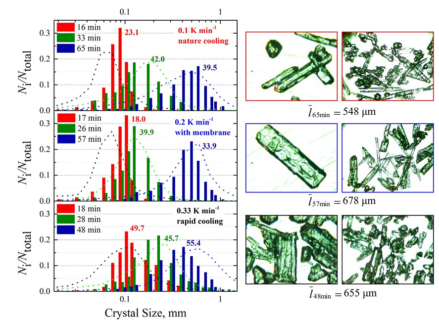 在此基础上,利用微孔膜界面传质过程多参数耦合控制、调控精度高的优势,将微孔膜的亚微米级孔道作为结晶体系溶剂浓缩、分离的传质通道,通过高效微观混合,均匀传质,实现对晶体初级成核和生长过程的精确调控,最终获得晶体形态、粒度分布理想的产品。相关成果发表在国际化学工程领域重要期刊AIChE Journal上(DOI: 10.1002/aic.15069,论文作者:姜晓滨讲师、硕士生卢大鹏、肖武副教授、阮雪华讲师、本科生方建、贺高红教授)。研究结果表明,通过建立膜性能、结构和操作参数对结晶过程过饱和度的控制机制,有望突破现有结晶仪器单一参数调控的精度限制,将结晶过程的对体系浓度的调控精度提高近1个数量级,这对于结晶过程控制,优良晶体产品的制备具有重要意义。
