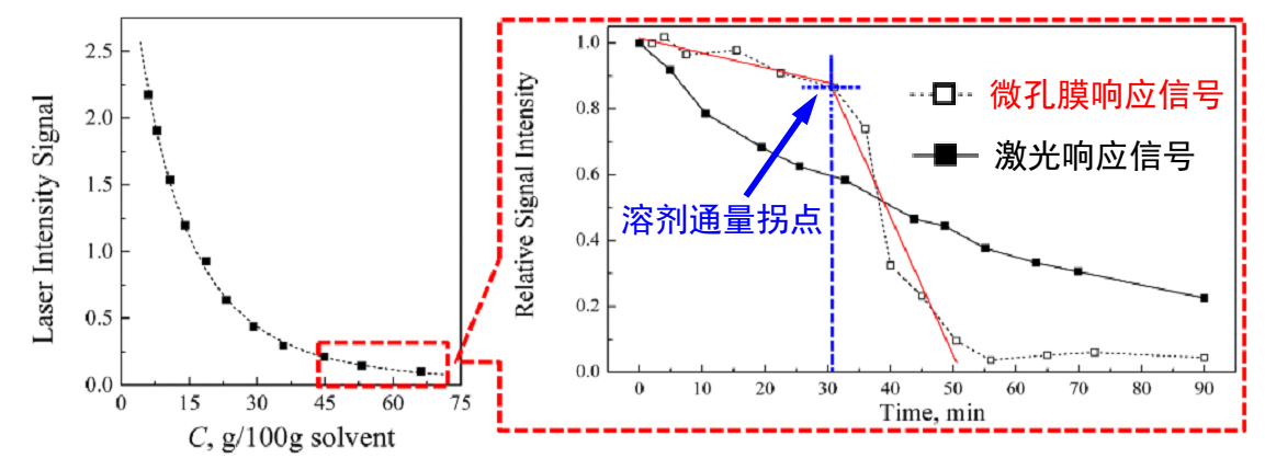 在研究中,团队创新性地将膜蒸馏过程中“晶体成核—膜孔堵塞—溶剂膜通量骤降”的连锁效应,应用于结晶介稳区测定,建立了一种不受溶液透光率限制的结晶成核响应新机制。相关成果发表在国际化学工程领域重要期刊Chemical Engineering Science上(DOI:10.1016/j.ces.2015.05.030,论文作者:姜晓滨讲师、阮雪华讲师、肖武副教授、硕士生卢大鹏、贺高红教授)。研究结果表明,对于经典的结晶体系KNO3水溶液体系,激光法与微孔膜响应法的介稳区宽度测定结果吻合,计算拟合成核指数一致;对低透光度无机盐体系,当溶液浓度接近饱和时,激光光强信号衰减为初始值的1/20~1/50,不能响应溶液中的成核。而利用微孔膜的溶剂通量衰减拐点,可以响应晶体成核,完成介稳区宽度的测定。采用这一创新方法,我们首次实现了CoSO4水溶液体晶介稳区宽度的直接测定。