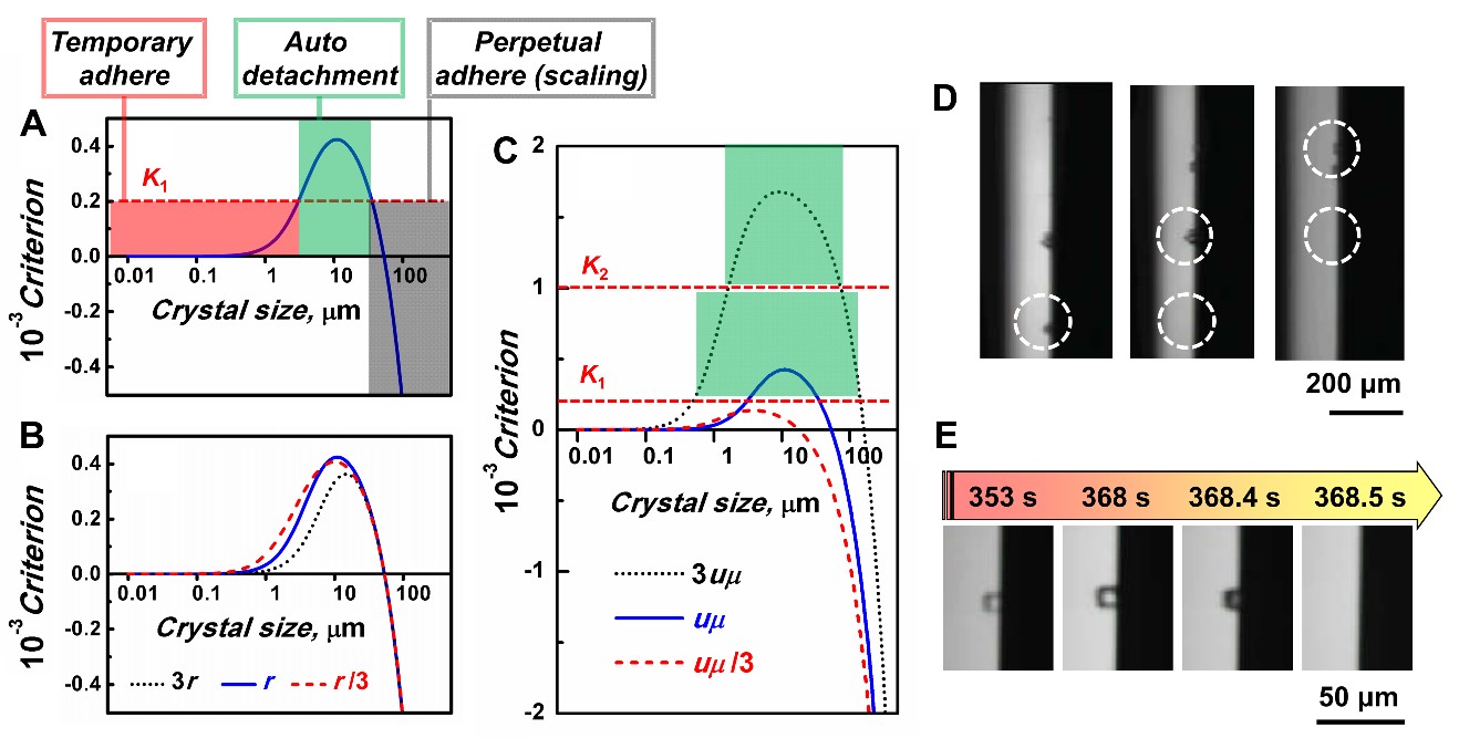 图1 晶核在膜界面滑移-脱附判据的影响因子模拟(A to C)和在线高速显微实验验证结果(D、E)。(图片来源:AIChE J., 2018, DOI: 10.1002/aic.16459)
