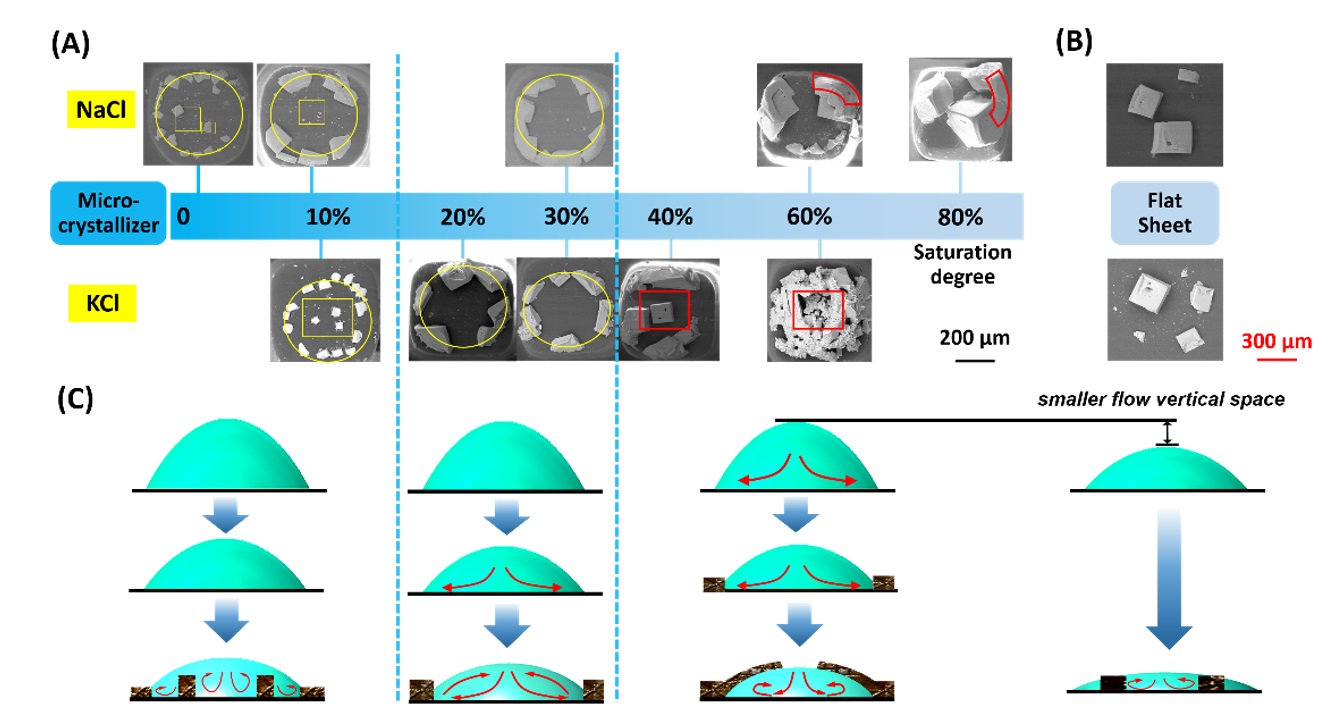 该结晶器由于滴加液滴重复性高、形貌及位置多样性可调,有效了构建不同成核能垒的微液滴蒸发三相界面;实验中,选择NaClKClCuCl2等典型无机盐溶液体系,探究限域微液滴空间内对晶体生长及分布规律,解释了非典型“咖啡环”、“枝状”晶体和无定形颗粒团聚等液滴结晶形态的形成机制(图2)。相比于传统平面结晶器,3D打印的微液滴结晶器具规则界面多样,可控性强,成核调控区间宽、可批量开展高通量实验等诸多优势,为进一步设计高效的微液滴蒸发结晶研究和生产平台开拓新的思路。