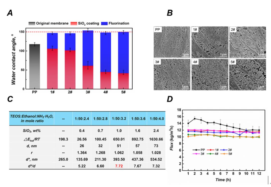 大连理工大学膜科学与技术团队的姜晓滨教授提出利用表面改性的方法,通过负载SiO2纳米颗粒构建表面粗糙结构,接枝1H, 1H, 2H, 2H-全氟癸基三乙氧基硅烷(PFDTS)降低膜表面能;同时建立考虑纳米颗粒直径、膜表面接触角、表面粗糙度等参数的成核能垒模型,预测膜界面几何参数对膜界面诱导成核能垒,揭示了表面颗粒尺寸、临界成核尺寸、膜表面超疏水性与异相成核能垒的影响机制,进一步指导膜表面结构优化。研究表明,当纳米颗粒尺寸约为50 nm时,制备的超疏水聚丙烯(PP)微孔复合膜具有优异的抗污染性、抗润湿性和通量稳定性,静态水接触角可达158.5o(图1)。