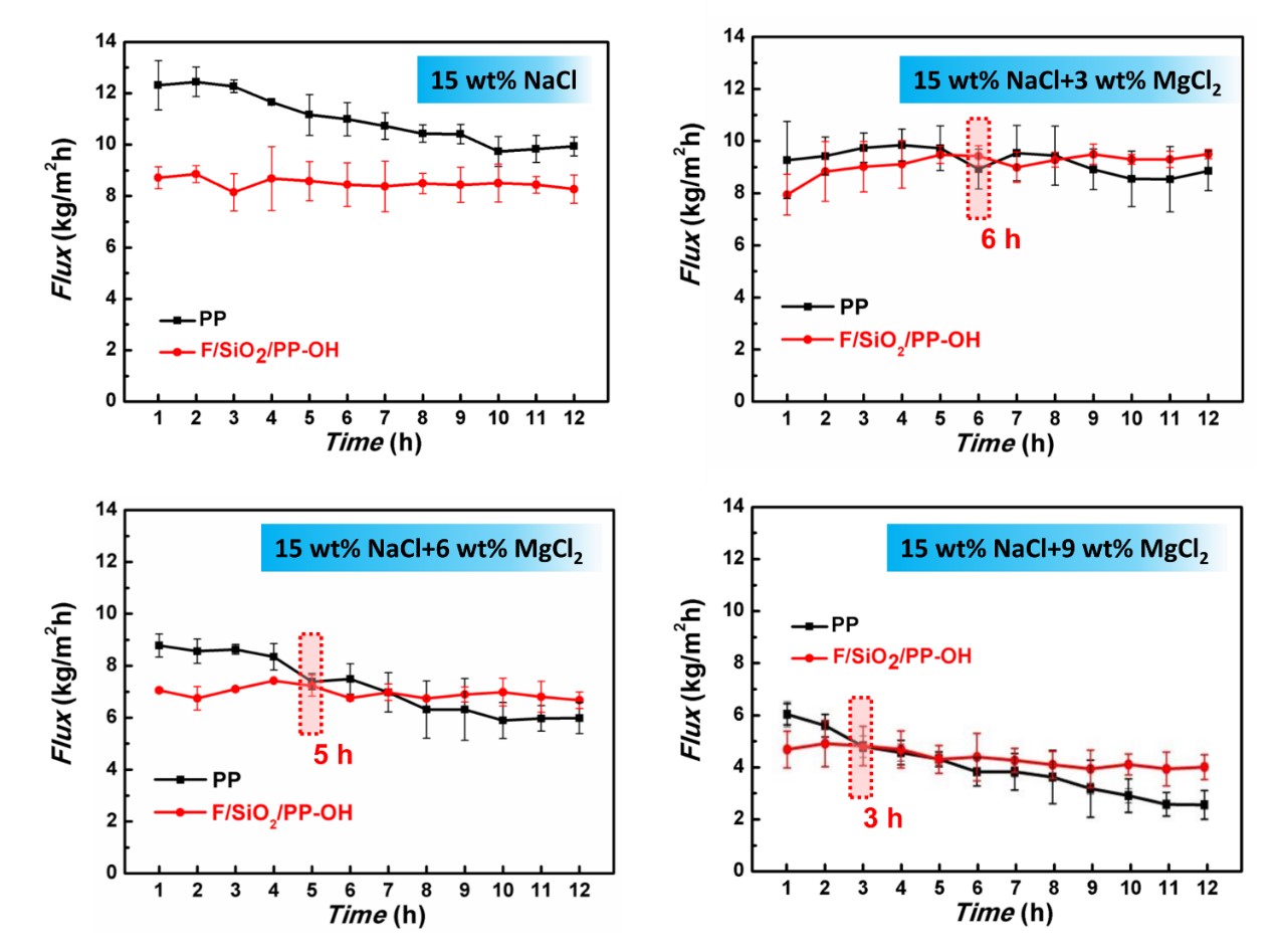 研发的超疏水膜应用于真空膜蒸馏中处理高浓度NaCl (15 wt%)/MgCl2 (3 wt%- 9 wt%)混合溶液,测试了不同流速(45-340 mL/min)及进料浓度对膜性能的影响,分析了溶液中Na+Mg2+的结构特征对膜渗透通量和浓差极化效应的影响机制。结果表明,当进料溶液MgCl2浓度为6 wt%9 wt%时,制备的超疏水膜仍显示出良好的通量稳定性,其通量衰减率仅为PP原膜的1/4(图2)。当进料流速降低时,原膜通量显著下降,制备的超疏水膜通量较为稳定,证明了超疏水膜可有效减轻浓差极化现象的优越性能。同时,制备的超疏水膜在连续运行后,依然保持了清洁的表面、断面结构,表现出优异的抗润湿性、抗污染性和高浓度盐耐受性(图3)。