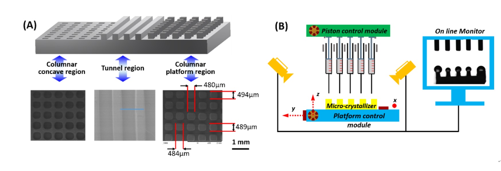 图1:(A)3D打印加工的微结晶器(B)以微结晶器为核心的液滴滴加系统。