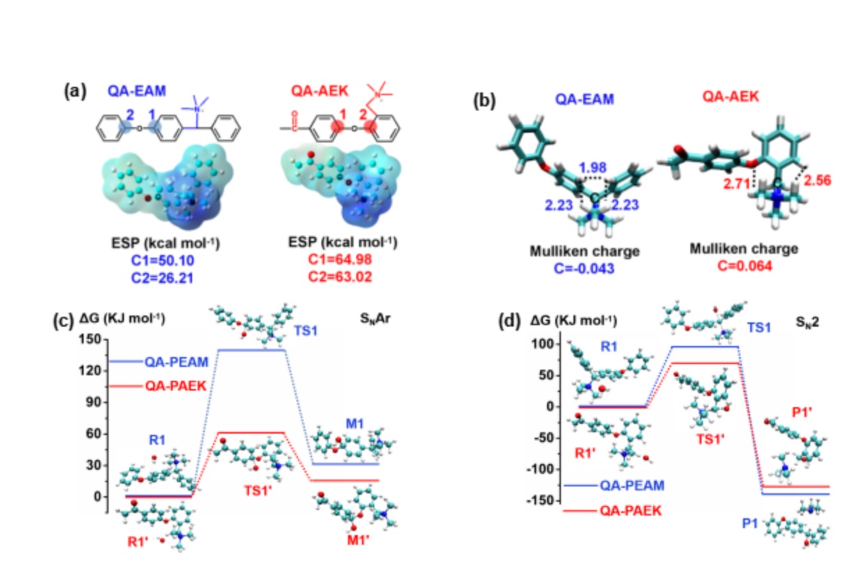 图2. (a) QA-EAM和QA-AEK模型的静电势(ESP),(b) QA-EAM和QA-AEK模型的Mulliken电荷,(c)QA-EAM和QA-AEK模型化SNAr反应活化能,(d)QA-EAM和QA-AEK模型SN2反应的自由能
