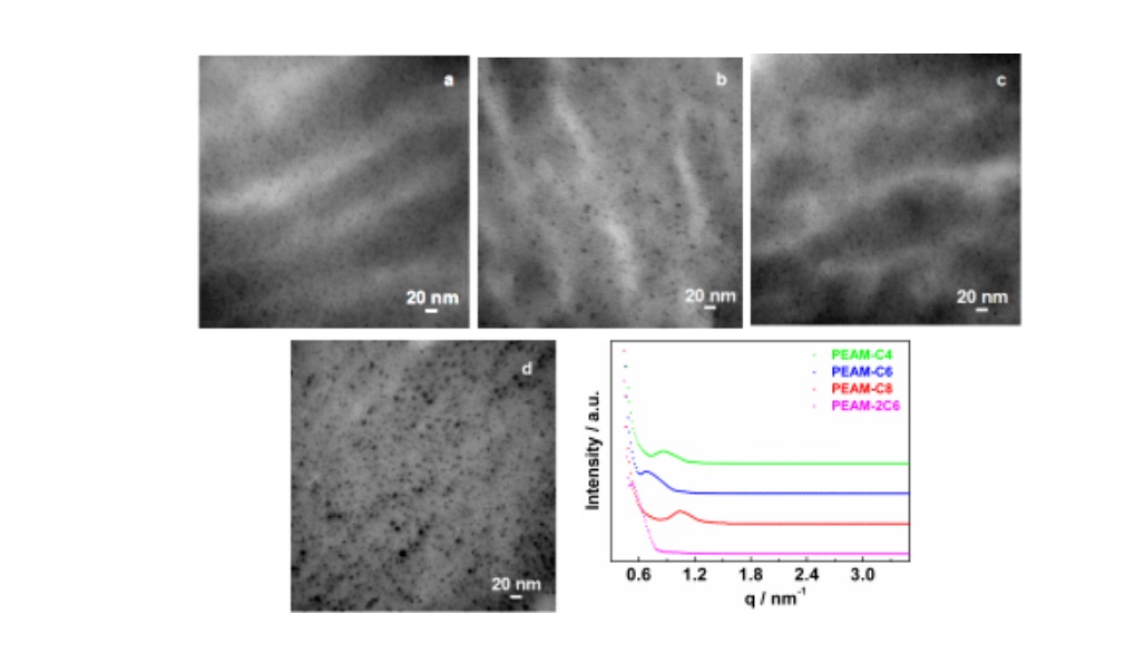 图7. 侧链型AEM的TEM和SAXS图。(a)PEAM-C4,(b)PEAM-C6,(c)PEAM-C8和(d)PEAM-2C6。