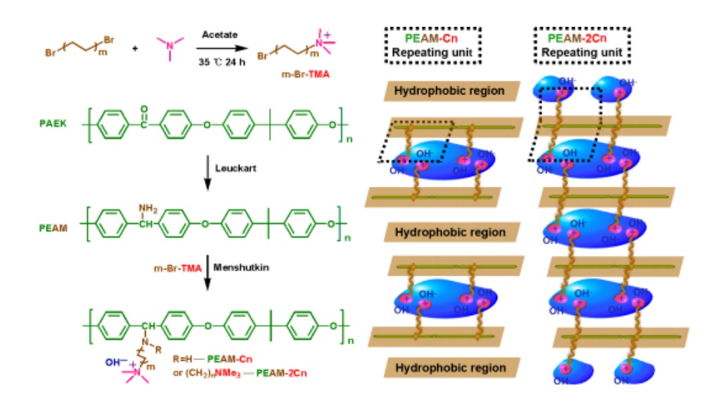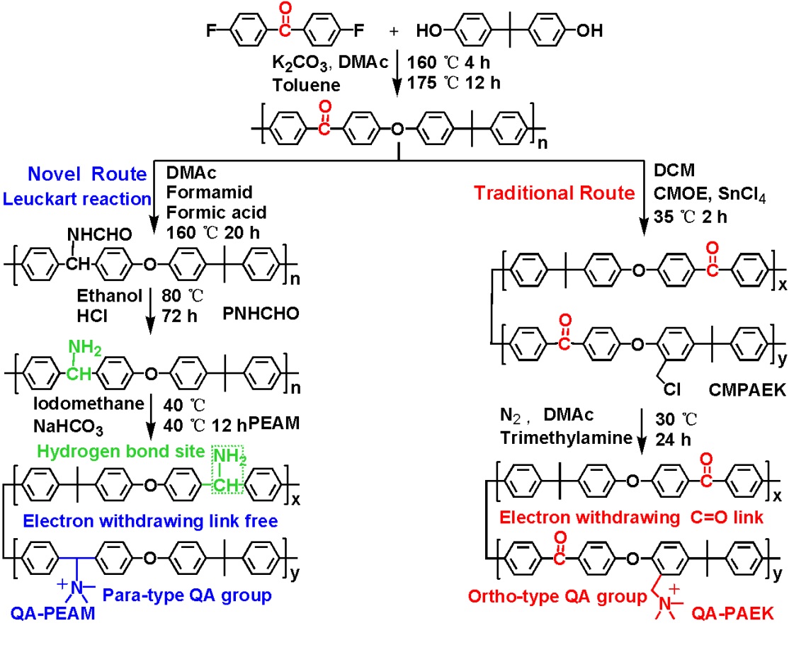 图1. 新型QA-PEAM和常规QA-PAEK聚合物电解质的合成路线