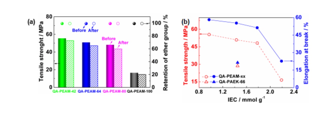 图3. (a) AEM在碱处理前后(4 M KOH,80°C,400 h)的拉伸强度(TS)和醚键含量 ,(b)室温条件,AEM在不同IEC下的的拉伸强度(TS)和断裂伸长率(EB)。