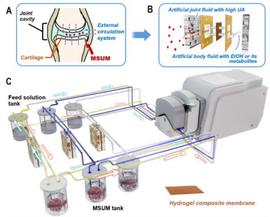 图1. 面向痛风防治的水凝胶复合膜仿生研究平台构建思路:(A)痛风患者膝关节模型;(B)复合膜单元模拟酒精摄入后尿酸钠结晶过程;(C)多通道仿生研究平台示意图。