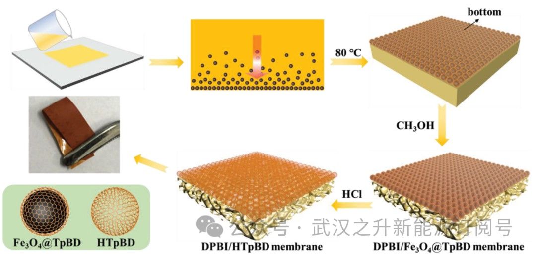 共价有机骨架(COFs)具有纳米级孔隙,较高的孔隙率和热化学稳定性,广泛用作复合膜,并在分离领域得到广泛应用。制备复合膜的传统方法,如喷涂、旋涂、压力辅助或真空辅助过滤等,都存在选择层容易脱落等问题。本文提出了一种铸造-沉淀-蒸发一体化的方法制备柔性COF复合膜(DPBI/HTpBD)。设计了由空心球壳COF选择层(HTpBD)和多孔支撑层构成的DPBI/HTpBD复合膜,并将其应用于钒液流电池中。空心球壳COF选择层具有优异的库仑效率(CE, 99.5%)和电压效率(VE, 81.1%) (180 mA cm−2)。此外,共价键结合的COF内部刚性孔结构使DPBI/HTpBD复合膜具有优异的高温稳定性。与Nafion 212和DPBI原始膜相比(CE分别降低5.2%和3.3%),DPBI/HTpBD-9复合膜基电池的CE在温度从25℃升高到55℃时仅降低0.9%。本研究为高离子选择性和高温稳定性电池膜的制备提供了一种新的方法。