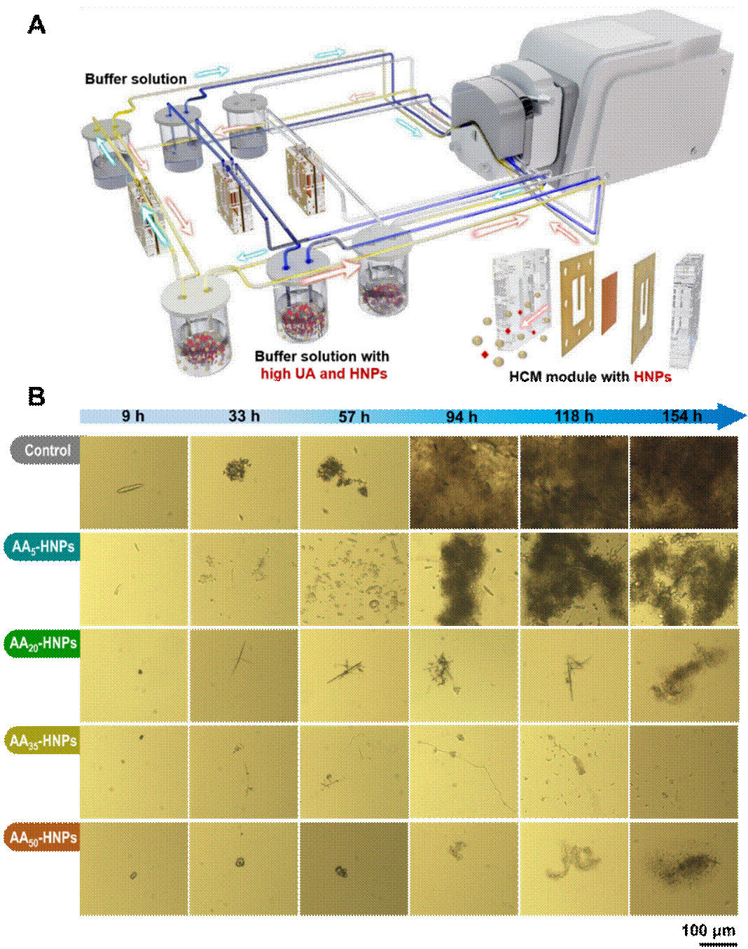 首先,研究团队采用自由基沉淀聚合法,制备了系列不同丙烯酸含量的水凝胶纳米颗粒(AAX-HNPs)。随后,通过DLS、FTIR、WCA、Zeta电位、SEM等表征手段,证实了具有不同颗粒尺寸、电负性、疏水性,以及良好分散稳定性和良好生物相容性AAX-HNPs的成功制备(图1)。随后,通过自主搭建的体外动态仿生平台,探究了AAX-HNPs对MSUM晶体结晶过程的影响。实验结果表明,当丙烯酸含量为20 mol%时,AA20-HNPs表现出最优的抑制活性,MSUM晶体的产率仅为对照组的1%,且大量晶体的出现时间由94 h显著延长至334 h(图2)。