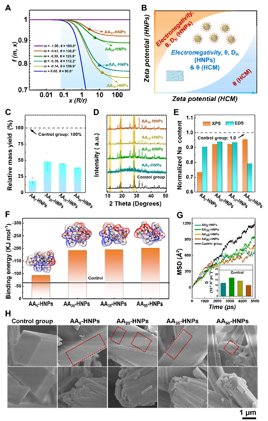 Fletcher异相成核模型与分子动力学模拟计算结果表明,AAx-HNPs的高抑制活性主要归因于其出色的钠离子锚定能力和疏水性,提高了MSUM晶体结晶过程的成核能垒;其与晶面之间产生的强静电、吸附与分散协同作用,降低了MSUM晶体的生长速率(图3)。