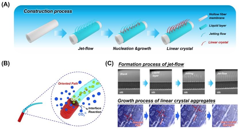 图1 膜界面重构的喷射流限域结晶制备晶体聚集体(A)由喷射流构建线状晶体聚集体的过程示意图(B)柱状喷射流界面限域结晶机理图(C)喷射流的形成过程和晶体聚集体的生长过程