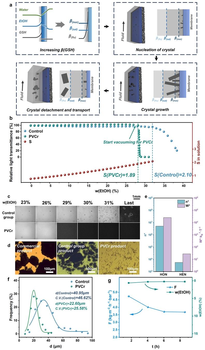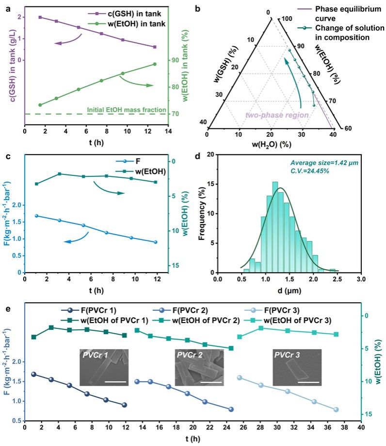 在渗透汽化-膜结晶过程中,谷胱甘肽的成核和生长降低了模拟废水中的浓度。随着乙醇浓度的增加,结晶器中的溶液沿着两相平衡线变化,这表明在结晶过程中没有明显的过饱和现象(图 4b)。初始的低过饱和度被膜诱导成核所消耗,使得后续晶体在乙醇富集产生的温和驱动力下生长,并防止了二次成核。图 4d 中通过光学显微镜对最终产物的分析显示,平均晶体尺寸 d = 1.42 μm,变异系数 C.V. = 24.45%,表明小晶体分布均匀。这些产物被表征为无团聚的小单晶体产品,适合用作传统结晶过程中的晶种。上清液由于乙醇浓度高(>90%),也具有作为谷胱甘肽生产的反溶剂的价值,可通过过滤获得。平均晶体尺寸小是由于模拟废水中活性药物成分(API)浓度低,在 PVCr 过程中初始成核后限制了晶体生长。