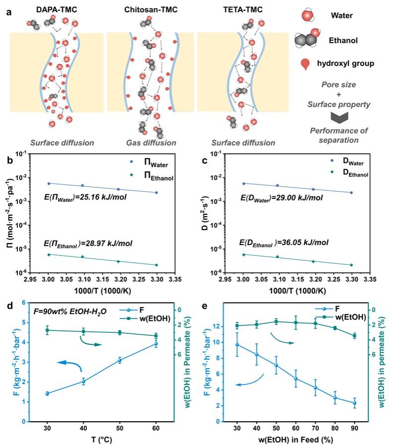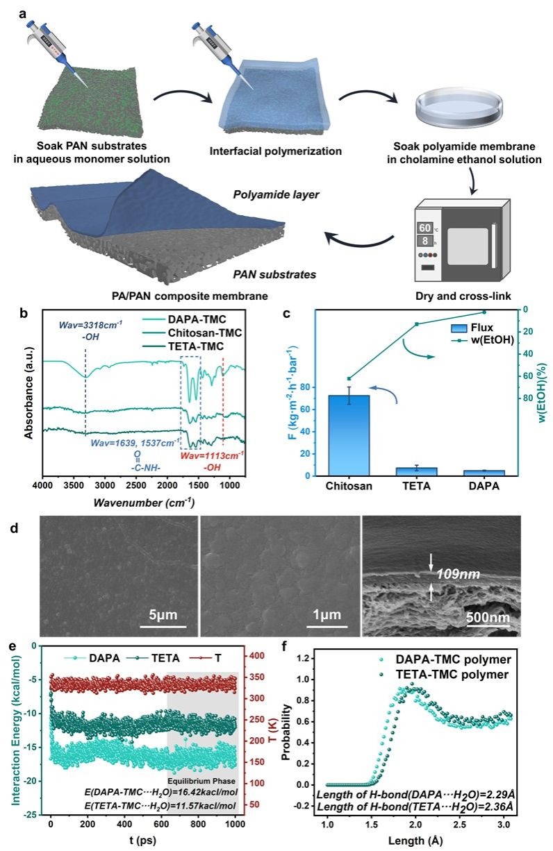 如图1所示,使用DAPA为水相单体,通过界面聚合制备了渗透汽化材料表现出了较为优秀的水-醇分离性能,并在图2中针对跨膜传质的能量变化进行了分析。由于制备的膜材料中富含羟基,增大了聚合物与水分子之间的相互作用力(图1 e 与 f),这降低了水分子跨膜传质时的活化能(图2 b 和 c),最终提高了选择性。