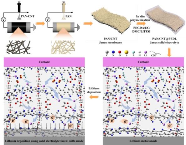 固态聚合物电解质具有良好的柔韧性和加工性,但存在室温离子电导率低等问题。在聚合物中添加增塑剂是提高离子电导率的有效方法,但会降低电解质膜的机械强度,难以抑制锂枝晶生长,造成离子电导率与锂枝晶抑制能力之间存在制衡效应。因此,设计具有高离子电导率和抑制锂枝晶功能的聚合物固态电解质具有重要意义。大连理工大学贺高红教授、齐新鸿副教授、李易杭硕士生等提出了一种离子/离子和电子导电Janus固体电解质膜设计,Janus固态电解质面向正极侧传导锂离子,面向负极侧同时传导锂离子和电子,具有高离子电导率和定向锂沉积功能,诱导锂均匀沉积于膜内和锂金属负极界面处,解决锂枝晶生长问题。该研究为设计具有高离子电导率和引导锂定向沉积能力的固态电解质提供了创新性解决方案。